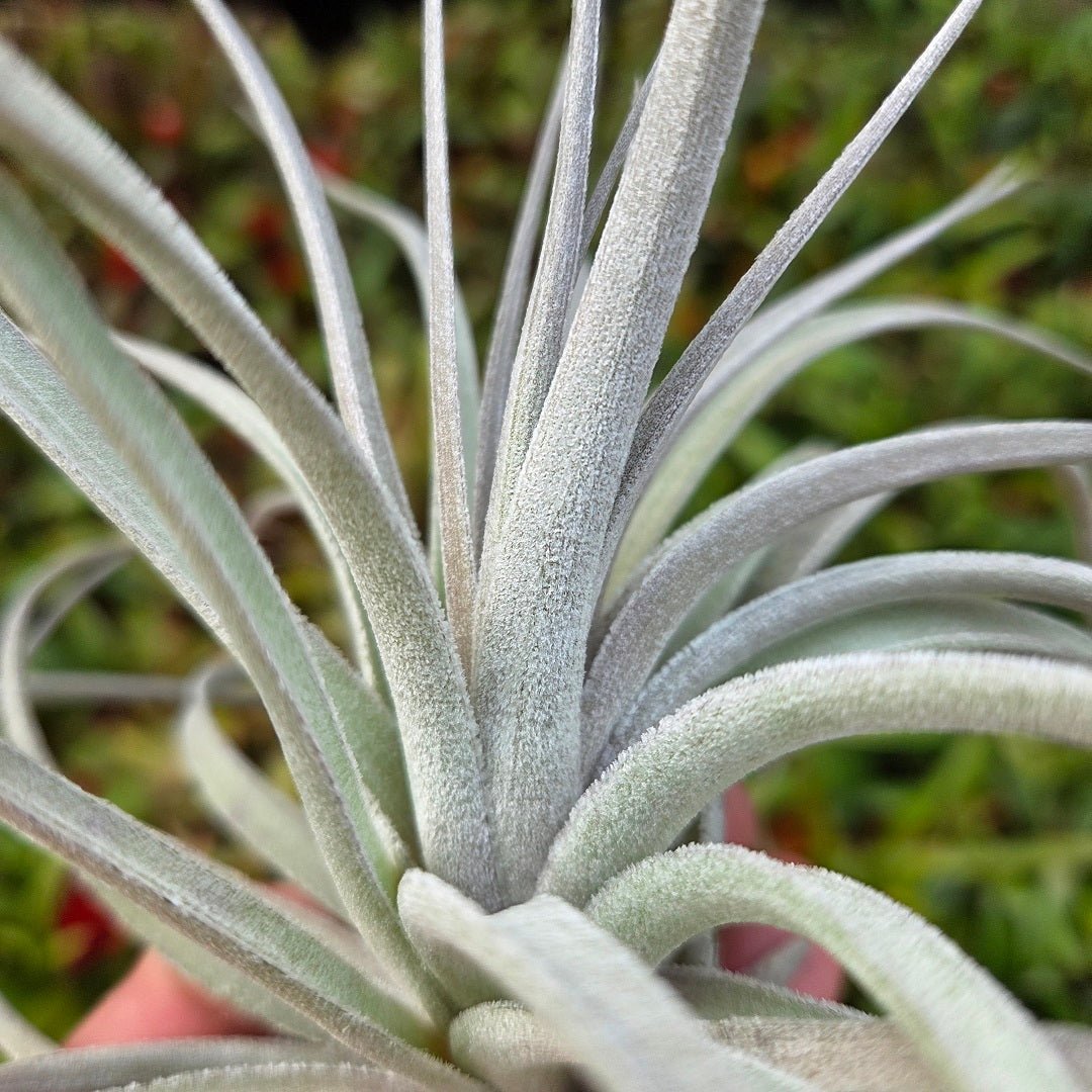 Tillandsia recurvifolia × Tillandsia gardneri, combines some of the best traits of both parents — the soft, silvery texture of T. gardneri and the elegant, recurved shape of T. recurvifolia. It’s one of those hybrids that looks delicate but is actually pretty tough and easy to grow. The plant has arching, silvery leaves covered in fine trichomes, giving it a frosted appearance.